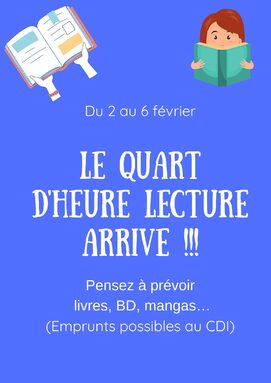 Lundi 2, mardi 3, jeudi 5 et vendredi 6 février, entre 15h10 et 15h25, aura lieu le Quart d'heure lecture.